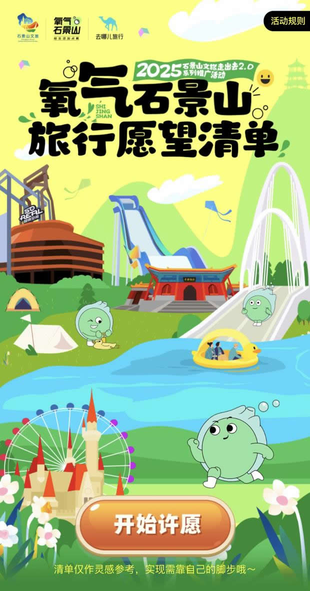 在“去哪兒”旅行APP上線“氧氣石景山”文旅專題頁,不僅整合酒店榜單、景區(qū)門票、優(yōu)質(zhì)攻略等核心文旅資源,更特別設(shè)置石景山區(qū)對(duì)口支援和協(xié)作地文旅產(chǎn)品版塊,實(shí)現(xiàn)“石景山推廣+支援地區(qū)助銷”雙重價(jià)值。同步推出的“旅行打卡愿望清單”H5,線上用戶可點(diǎn)亮自己的石景山旅游心愿,生成專屬旅行愿望清單;在高校路演活動(dòng)中,大學(xué)生可分享H5到社交媒體作為參與活動(dòng)的入場券——既為高;顒(dòng)預(yù)熱,更成為高校路演入場憑證,串聯(lián)起“線上互動(dòng)-線下參與”的閉環(huán)。