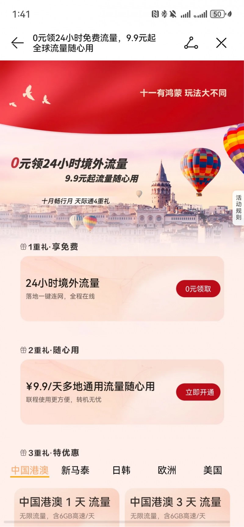 國慶長假將至,出境游熱度飆升,9月17日至10月31日,華為天際通「十月暢行月」福利活動開啟,推出4重超值禮遇,從免費(fèi)流量、按天計費(fèi)到本地權(quán)益全覆蓋,讓用戶真正實(shí)現(xiàn)說走就走,暢行無憂。