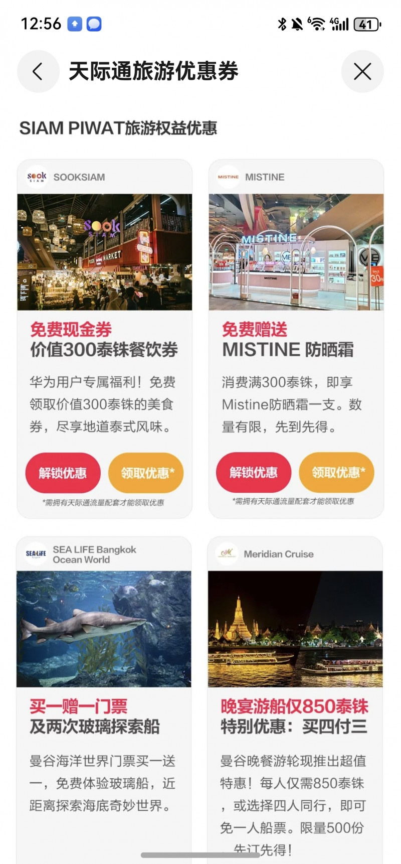 華為手機(jī)用戶開啟天際通流量后,可以在泰國、馬來西亞、越南、印尼免費(fèi)領(lǐng)取Grab游客優(yōu)惠禮包,憑Grab優(yōu)惠禮包即可享受精選服務(wù),包括機(jī)場接送、打車折扣、外賣餐飲、超市購物等出游場景,輕松暢游東南亞。還可領(lǐng)取Klook旅游權(quán)益優(yōu)惠,無論您是在中國香港&澳門暢游看夜景,還是在日本觀賞和風(fēng)之美,在韓國感受韓風(fēng)潮流、越南邂逅燈火古鎮(zhèn),即可享受景點(diǎn)購票全單95折優(yōu)惠。在活動頁還可領(lǐng)取朗廷卓逸會全球酒店住宿禮遇及專屬優(yōu)惠房價,共覆蓋全球超過30家知名酒店。