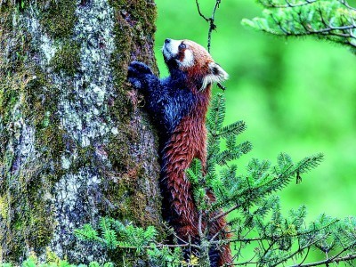 正在攀爬冷杉的小熊貓。本報(bào)記者 周夢(mèng)爽攝