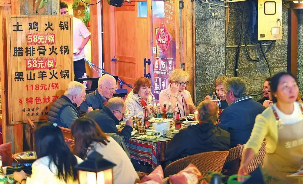 憑借優(yōu)美風光、濃郁風情、獨特文化體驗和日趨完善的服務,麗江吸引眾多外國游客前來體驗“有一種叫云南的生活”。據(jù)麗江市公安局出入境管理支隊統(tǒng)計數(shù)據(jù),今年以來,全市臨時入境人員達78.97萬人次,同比增長47%。圖為外國游客在麗江古城品嘗美食。(記者 陳飛)