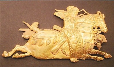 吐蕃騎射武士形飾牌造型威武,動感十足,格外引人注目。騎者纏頭巾,頭巾下方兩條發(fā)辮隨風(fēng)飛舞,雙目圓瞪,嘴下有濃密的絡(luò)腮胡須;身穿緊身三角形大翻領(lǐng)長袍,雙手拉弓欲射,腰部系帶,其上垂掛箭囊,腰后露出刀柄。馬尾打有結(jié)扣,杏葉凌空飛動,氣勢撼人。金飾牌背面殘存帶黑漆皮的薄木片,上面有金釘將飾牌與木片定綴在一起,可知此飾牌原來應(yīng)為某件木質(zhì)器皿上的裝飾物。“這件飾牌的造型受到西亞薩珊王朝金銀器上的帝王狩獵圖影響,而騎士的裝束卻是吐蕃風(fēng)格,體現(xiàn)了文化的交融。”趙婧說,青海省都蘭縣熱水墓群出土了相似的騎射形金飾片,亦為吐蕃時期的器物。